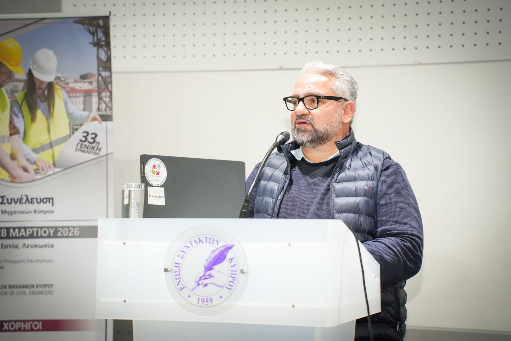 Πραγματοποιήθηκε με επιτυχία το Σάββατο, 28 Μαρτίου 2026, η 33η Ετήσια Γενική Συνέλευση του Συλλόγου Πολιτικών Μηχανικών Κύπρου (ΣΠΟΛΜΗΚ), στη Δημοσιογραφική Εστία, στη Λευκωσία. Η εκδήλωση είχε τεθεί υπό την αιγίδα του Έντιμου Υπουργού Εσωτερικών, κ. Κωνσταντίνου Ιωάννου.