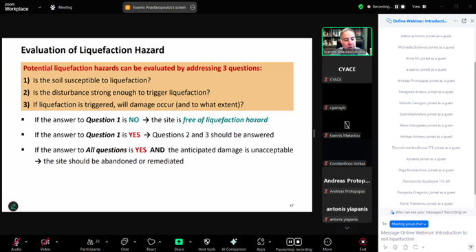 H Επιτροπή Δομοστατικών & Γεωτεχνικών Θεμάτων του ΣΠΟΛΜΗΚ, διοργάνωσε την Τετάρτη, 28 Μαίου 2025, το διαδικτυακό σεμινάριο με θέμα: Introduction to soil liquefaction. Εισηγητής ήταν ο Δρ Ιωάννης Αναστασόπουλος, Καθηγητής Γεωτεχνικής Μηχανικής του ETH Zurich.