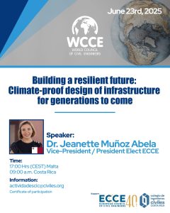 This insightful session, organised by the World Council of Civil Engineers (WCCE) and the European Council of Civil Engineers (ECCE), with the support of the Colegio de Ingenieros Civiles de Costa Rica, will explore the importance of resilient and climate-proof infrastructure design, addressing challenges and solutions critical for sustainable development.