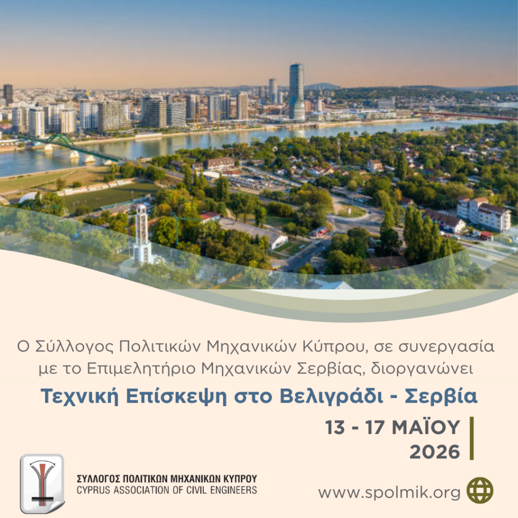 Τεχνική Επίσκεψη στο Βελιγράδι Ο Σύλλογος Πολιτικών Μηχανικών Κύπρου, σε συνεργασία με το Επιμελητήριο Μηχανικών Σερβίας (Serbian Chamber of Engineers), διοργανώνει Τεχνική Επίσκεψη στο Βελιγράδι, Σερβία. 🗓 13 – 17 Μαΐου 2026 ℹ️ Περισσότερες πληροφορίες & Πρόγραμμα ταξιδιού, εδώ. Κόστος συμμετοχής/κρατήσεις. Για μέλη του Συλλόγου με τακτοποιημένες οφειλές €850 το άτομο για μονόκλινο δωμάτιο €700