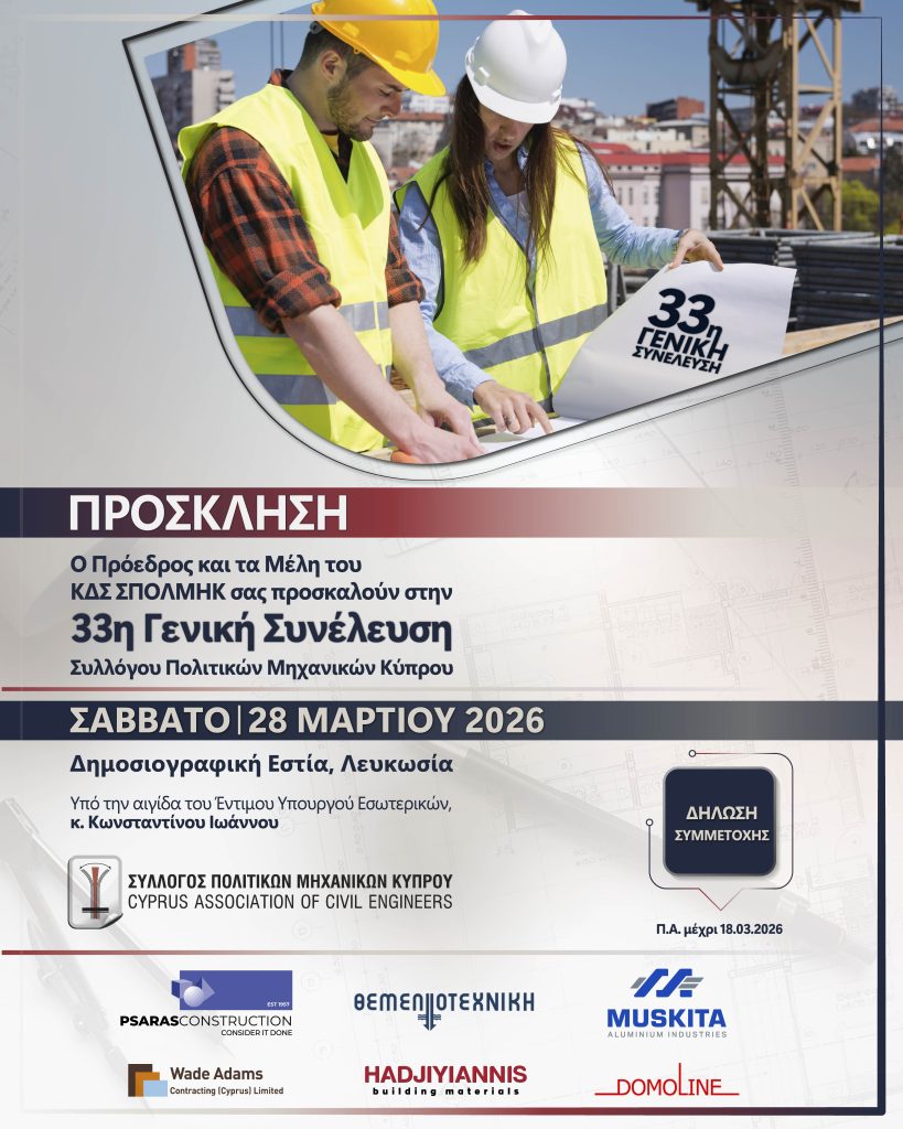 Δελτίο Τύπου – 33η Ετήσια Γενική Συνέλευση Συλλόγου Πολιτικών Μηχανικών Κύπρου Πραγματοποιήθηκε με επιτυχία το Σάββατο, 28 Μαρτίου 2026, η 33η Ετήσια Γενική Συνέλευση του Συλλόγου Πολιτικών Μηχανικών Κύπρου (ΣΠΟΛΜΗΚ), στη Δημοσιογραφική Εστία, στη Λευκωσία. Η εκδήλωση είχε τεθεί υπό την αιγίδα του Έντιμου Υπουργού Εσωτερικών, κ. Κωνσταντίνου Ιωάννου. Κατά τη διάρκεια της Συνέλευσης, ο […]