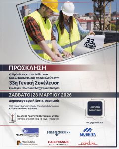 SAVE THE DATE – 33η Γενική Συνέλευση Συλλόγου Πολιτικών Μηχανικών ΚύπρουBy Spolmik / February 4, 2026 favorite_border iCal Export Google Calendar Outlook 365 Outlook Live March 28, 2026 09:00 AM Until March 28, 2026, 02:00 PM 5h SAVE THE DATE - 33η Γενική Συνέλευση Συλλόγου Πολιτικών Μηχανικών Κύπρου